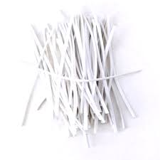 Amarrilhos de plástico com interior de arame para fechamento e fixação de sacos, objetos e embalagens em geral.